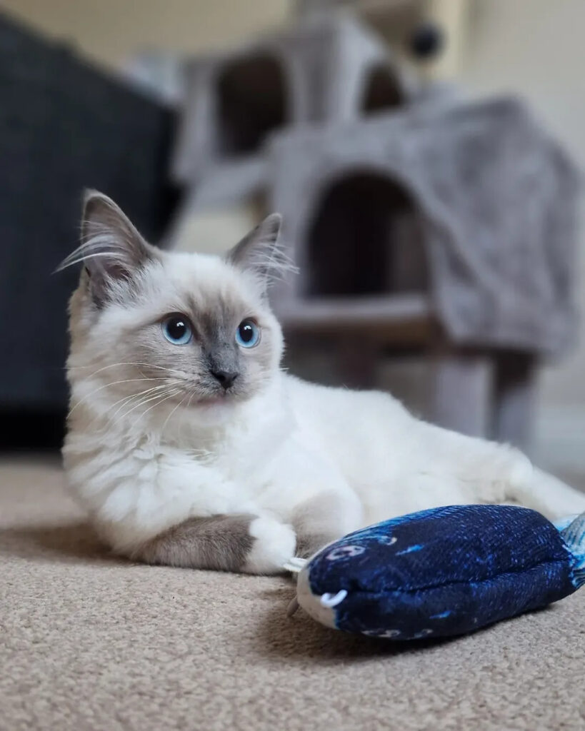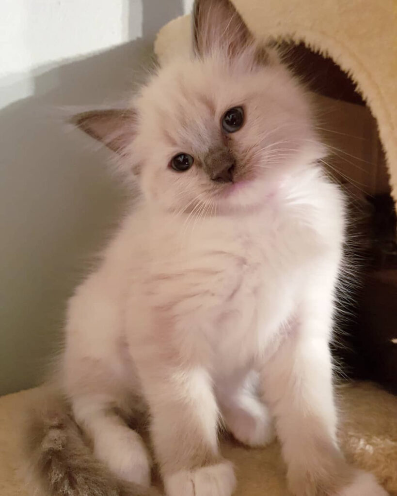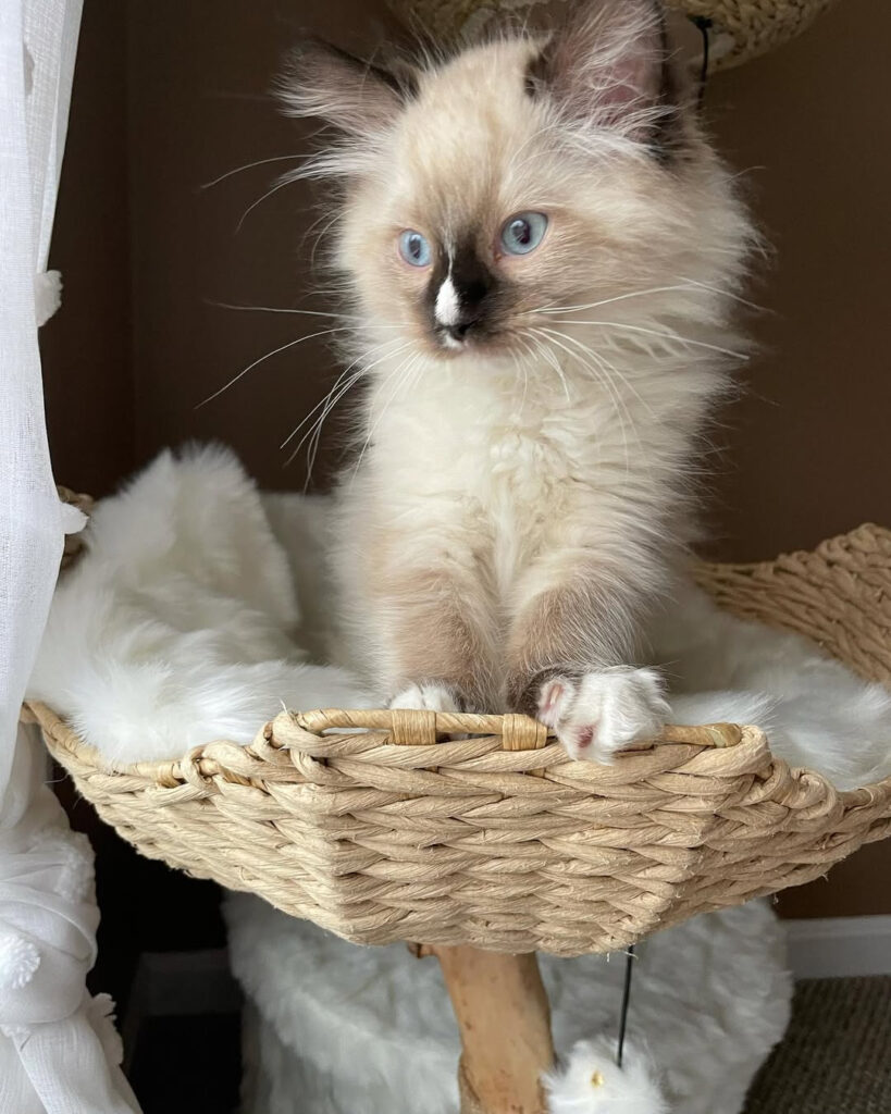 Dorian is a sweet and spirited 12-week-old Ragdoll kitten with a playful sparkle in her eyes. Full of charm and curiosity, she loves exploring her surroundings and snuggling up after a good play session. She is ready to go now.